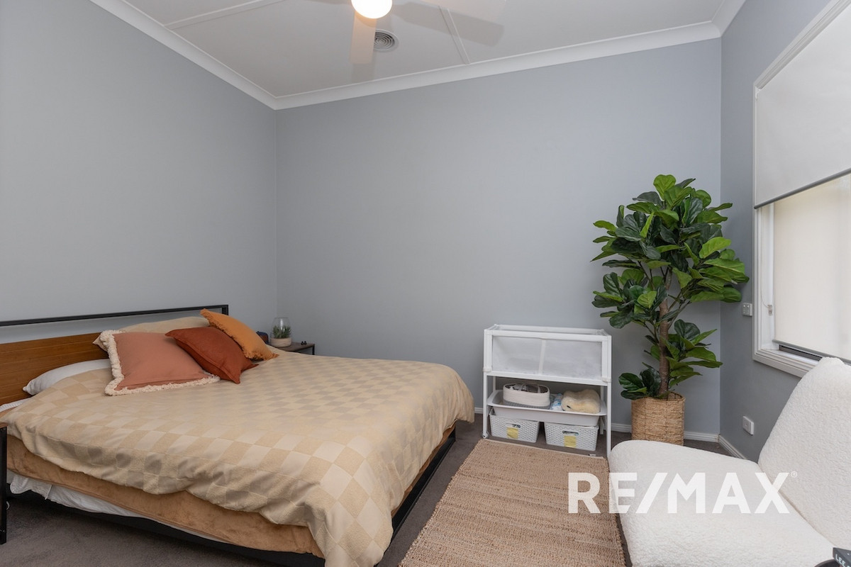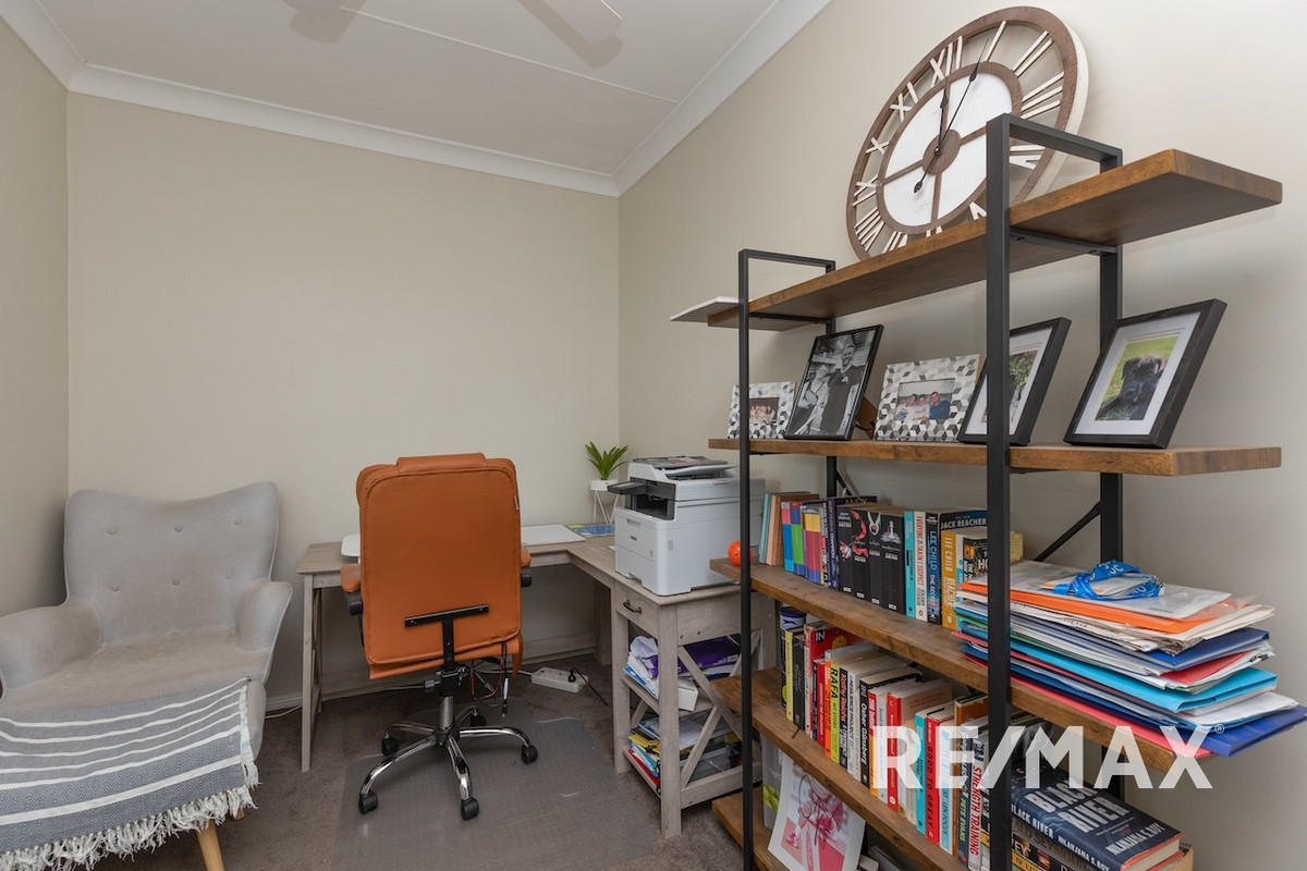 Four bedrooms, each featuring ceiling fans for year-round comfort, with the master featuring a built-in robe. The family bathroom is designed with a separate shower and bath, complemented by a laundry with a toilet and storage cupboard.